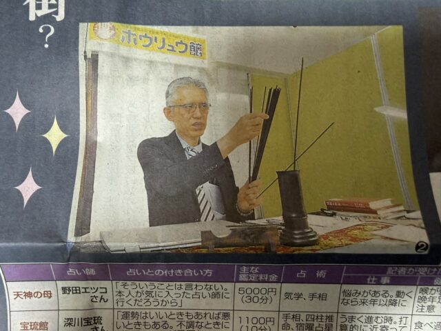 福岡占いの館「宝琉館」の深川宝琉が、地元芸人マサル君の相談を電話で鑑定する様子が紹介されています。