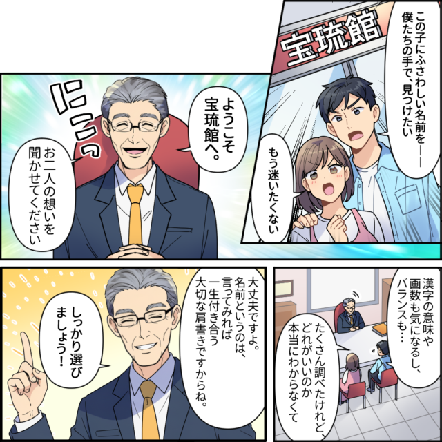 福岡占いの館「宝琉館」では、こちらで最終候補を絞り込み、最終候補の中から親がどれにするか、決めていく方法を取っています。
