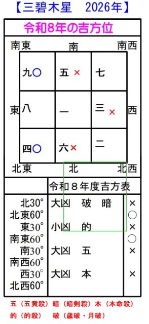 北東=吉、南東=吉、北=凶、南=凶、西=凶