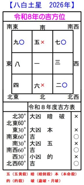 南東=吉、南西=吉、北西=吉、北=凶、南=凶、東=凶、西=凶