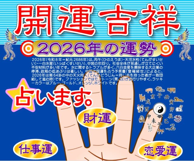 2026年(令和8年=紀元2686年)は丙午(ひのえうま)・天河水性(てんがすいせい)・一白水星(いっぱくすいせい)中宮の年回り。社会全体が見通した立てにくい不安材料が多い年です。