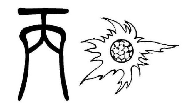 「丙(ひのえ)」:太陽の炎、ガスバーナーの火で強い集中力を意味する。積極的行動で明らかになること。先々まで見通せるので逆に心配ごとが増えるという意味もある。古代中国では丙は人の両手がピンと左右に張った様子。心がピンと張り詰めた緊張状態。