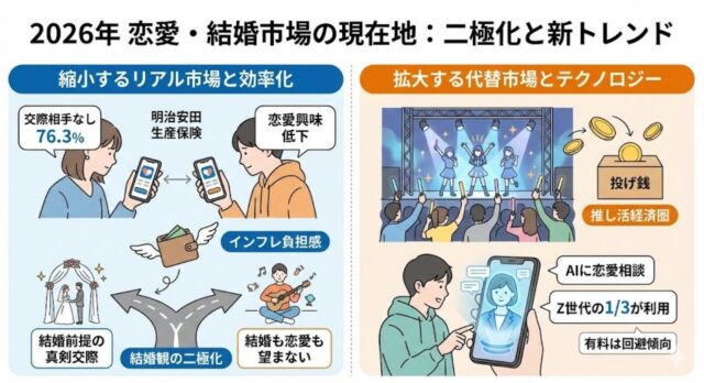 恋愛や交際への関心も低下傾向で、結婚願望を持つ人も減っています。女性は「結婚の必要性を感じない」、男性は「自由に使えるお金が減る」ことを理由に挙げているのが特徴。