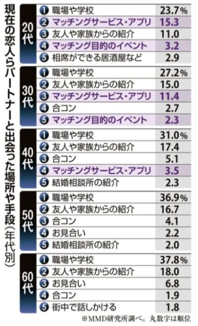 出会いのきっかけは依然として「知人の紹介」「職場」「飲み会・合コン」など対面型が上位を占めています。25~34歳ではマッチングアプリが3割に達し、デジタル経由の出会いも一定の存在感を示しているのが特徴です。