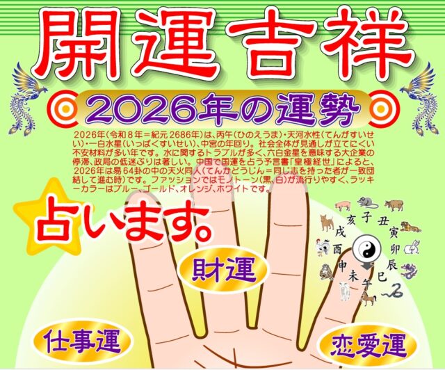 本場中国式の運命学で生まれ年の干支(えと)から金運、仕事運、恋愛結婚運、健康運、総合運を見ていきます。