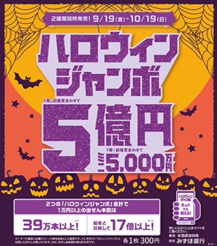 当選金額は、ハロウィンジャンボ宝くじが1等と前後賞を合わせて5億円。ハロウィンジャンボミニは1等と前後賞を合わせて5000万円です。抽選日は10月25日(金)です。宝くじもハロウィンを盛り立てています。