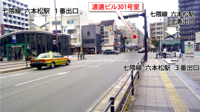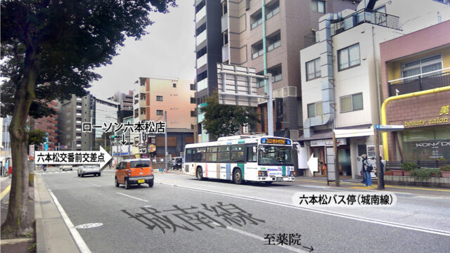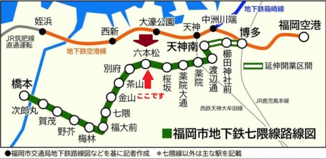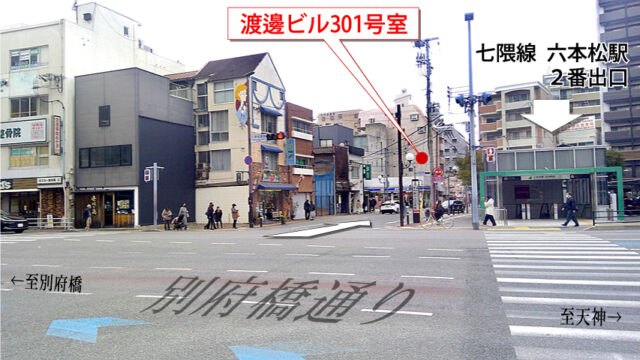 ▲地下鉄七隈線の六本松駅前の道路。この左手側の一つ目の信号を通過して5件目に宝琉館六本松本館があります