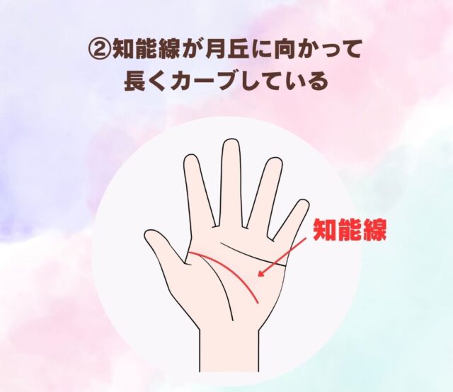 手のひらの横を走る知能線が、途中で大きくカーブして月丘の下部方向に深く下りている場合、豊かな想像力と独特な表現力があります。